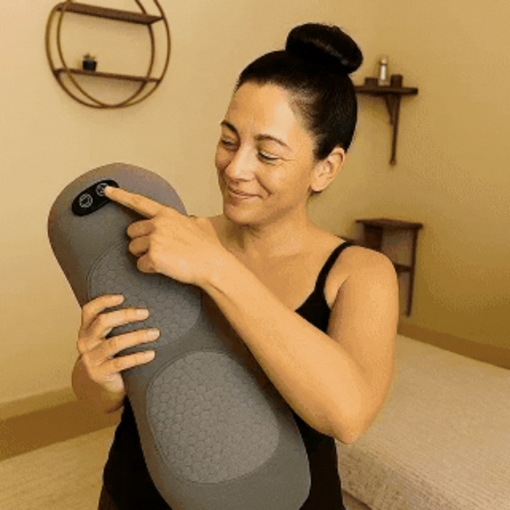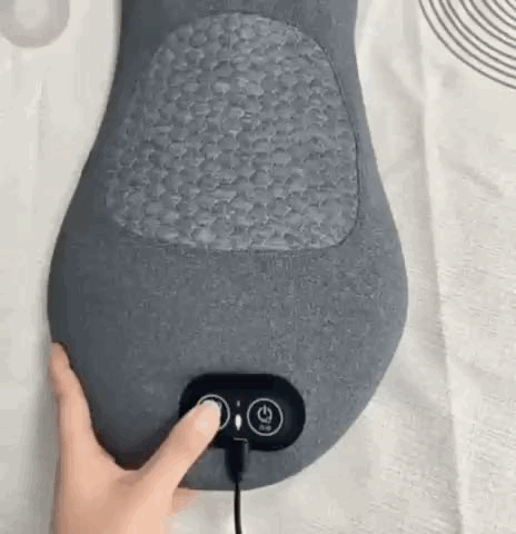 Press and hold the power button. The pillow starts its automatic cycle, blending traction, vibration massage, and gentle heat — no manual adjustments needed.