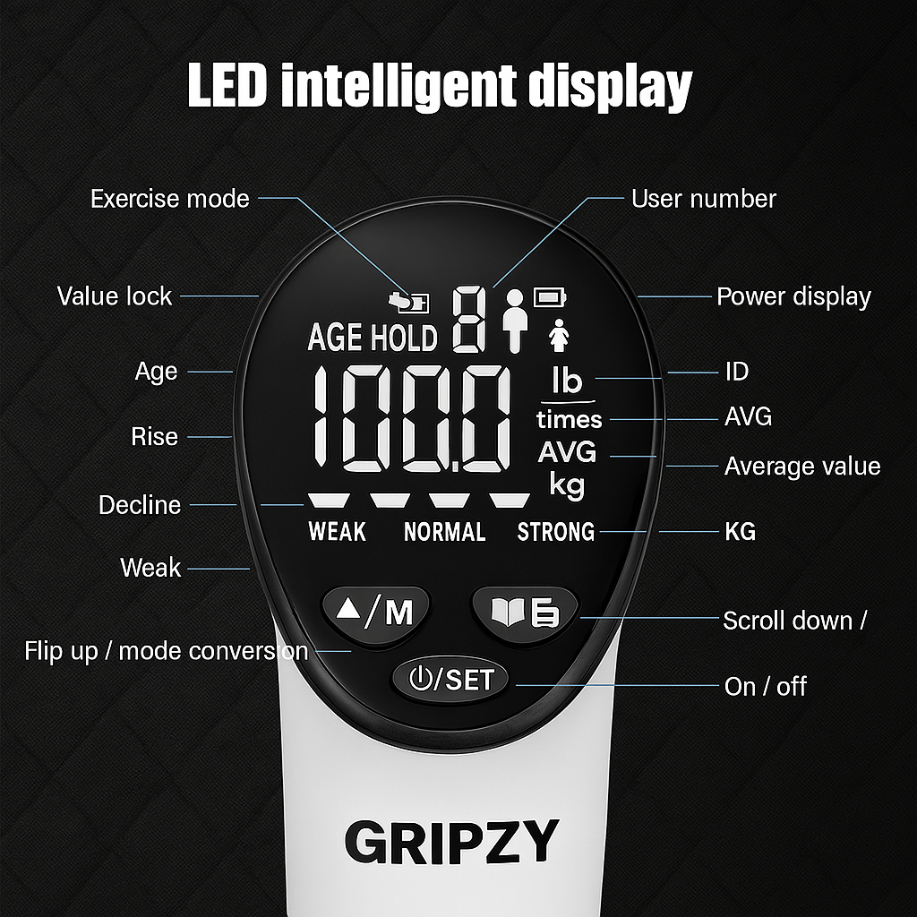 Gripzy™ is a rechargeable, smart hand grip trainer that tracks your grip strength in real-time with an LED display. It’s designed to help you build grip power, improve endurance, and recover from injuries — all while measuring your progress.
